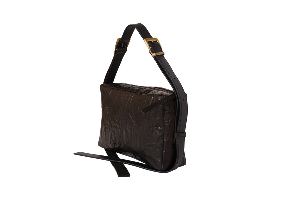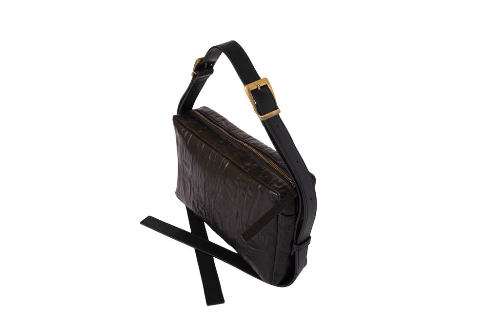 Borsa trasformabile in pelle effetto increspato con tracolla regolabile a doppia fibbia. Da indossare a spalla, a tracolla lunga o traversa.